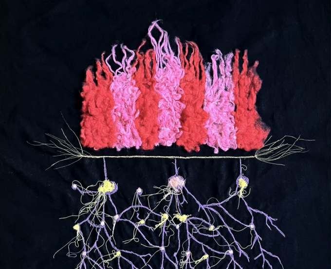 In der Ausstellung von Andrea Ziegler stehen textile Kartografien im Mittelpunkt. Ausgangspunkt sind Gespräche, Begegnungen und Wege der Bewohner*innen, deren Gedanken, Gefühle und Perspektiven gesammelt und von der Künstlerin in textile Arbeiten übersetzt wurden.